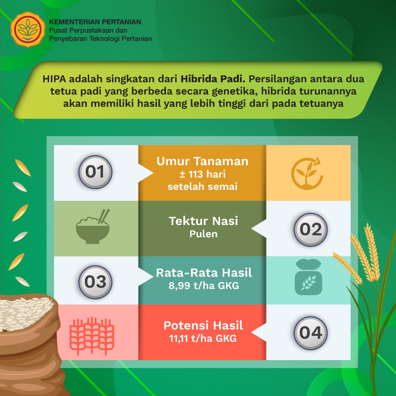 Produksi padi hibrida relatif tinggi karena merupakan produk persilangan antara dua tetua padi yang berbeda secara genetik. Apabila tetua-tetua diseleksi secara tepat maka hibrida turunannya akan memiliki vigor dan daya hasil yang lebih tinggi. Salah satu varietas padi yang dikembangkan adalah HIPA 21