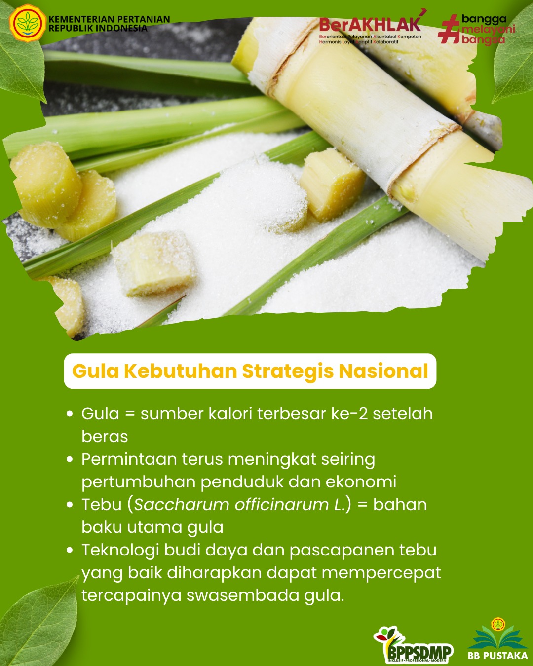 Gula merupakan salah satu komoditas pangan yang dibutuhkan masyarakat. Sebagai sumber kalori terbesar kedua setelah beras, gula memainkan peran penting dalam pola konsumsi masyarakat. Tanaman tebu (Saccharum officinarum L.) merupakan bahan baku utama gula. Untuk memenuhi kebutuhan gula yang semakin meningkat, berbagai upaya dilakukan untuk meningkatkan produktivitas tebu dengan praktik budi daya yang tepat.