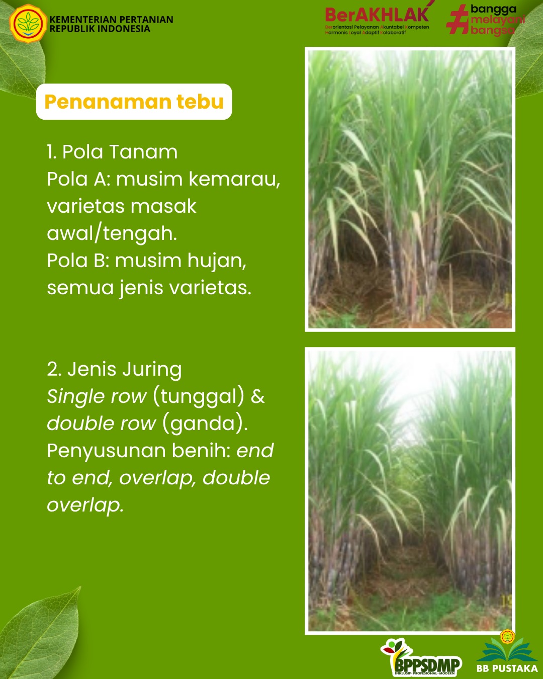 Pola A: waktu tanam musim kemarau, lahan sawah dan lahan kering yang dapat diairi, varietas masak awal dan tengah. Pola B: waktu tanam musim penghujan, lahan sawah dan lahan kering tadah hujan, varietas masak awal, tengah, dan lambat. Tata letak juring tebu dibagi menjadi dua yaitu: single row (juring tunggal) dan double row (juring ganda). Sistem pengaturan/penyusunan benih bagal dalam juring pada penanaman tebu dibedakan sebagai berikut: end to end (urut sepur), overlap, dan double overlap.