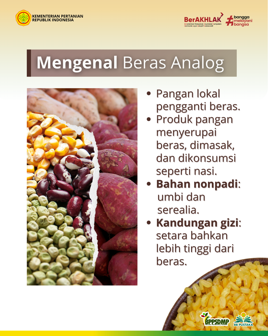 Ketergantungan tinggi terhadap beras masih mewarnai pola konsumsi masyarakat Indonesia. Padahal, tantangan produksi yang semakin kompleks menuntut arah baru kebijakan pangan melalui diversifikasi dan pemanfaatan sumber pangan lokal yang beragam. Beras analog merupakan perwujudan diversifikasi, terbuat dari bahan nonpadi yang dibentuk menyerupai beras dan dikonsumsi seperti nasi, menjadi alternatif pangan pokok dan ketahanan pangan berkelanjutan yang lebih inklusif.