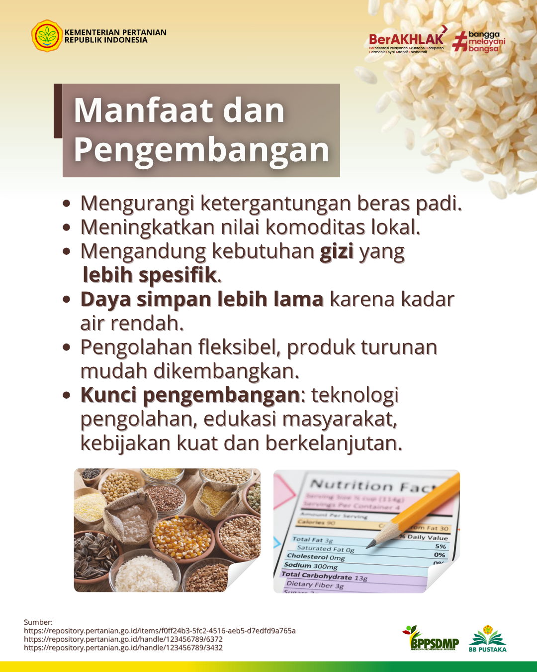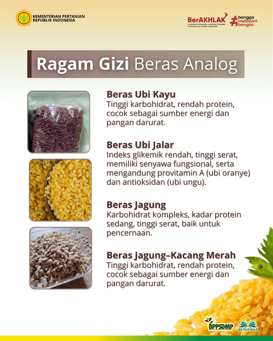 Inovasi beras analog akan memperkuat ketahanan pangan nasional melalui diversifikasi konsumsi dan pemberdayaan sumber daya lokal. Kolaborasi dan sinergi yang baik diperlukan untuk pengembangan ke depan sehingga beras analog menjadi pangan sehat berkelanjutan yang mandiri dan inklusif. (AM’2025)