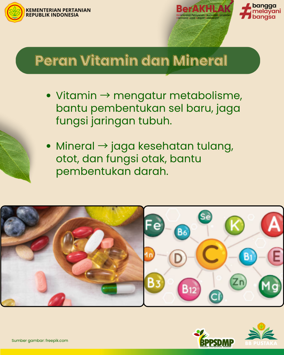 Vitamin dan mineral dibutuhkan dalam jumlah sedikit, namun berguna sebagai pengatur proses metabolisme dalam tubuh. Fungsi vitamin adalah sebagai bagian dari enzim atau ko-enzim untuk mengatur berbagai proses metabolisme dalam tubuh, mempertahankan fungsi berbagai jaringan tubuh, memengaruhi pertumbuhan dan pembentukan sel-sel baru, serta membantu pembuatan senyawa kimia tertentu dalam tubuh.