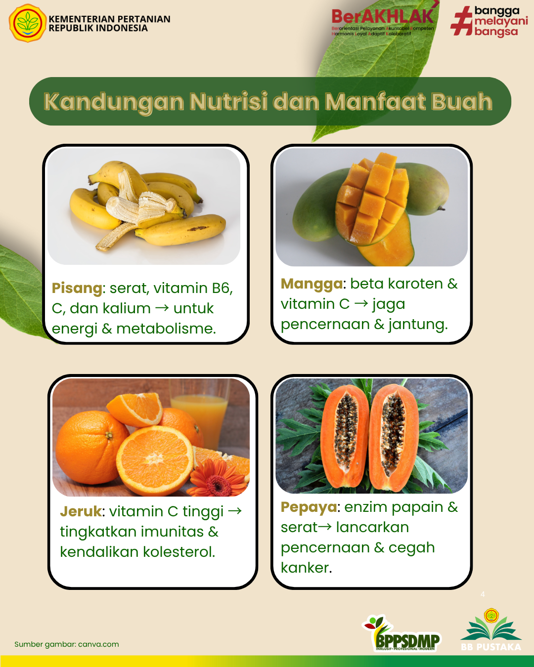 Vitamin tidak dapat dibuat oleh tubuh manusia dalam jumlah yang cukup. Oleh karena itu, harus diperoleh dari bahan pangan yang dikonsumsi. Bahan pangan sumber vitamin dan mineral banyak terdapat di dalam buah-buahan, antara lain pepaya, jeruk, mangga, jambu. Kandungan nutrisi dalam buah berperan penting dalam meningkatkan daya tahan tubuh, menjaga fungsi organ, serta mencegah berbagai penyakit kronis.