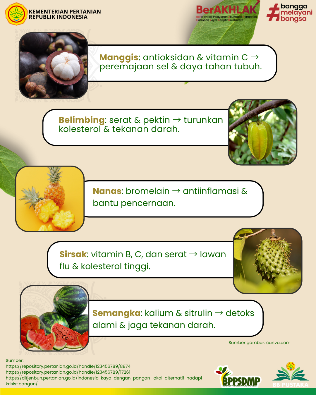 https://repository.pertanian.go.id/handle/123456789/8874 - Wardani, A. P., Arisandi, F. (2022). Diversifikasi pangan lokal untuk pemenuhan pangan gizi saat puasa. Balai Besar Pelatihan Pertanian Binuang.