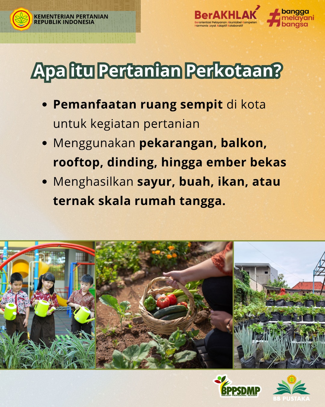 - Pendidikan lingkungan. Masyarakat dapat belajar tentang proses tumbuhnya tanaman, pentingnya menjaga alam, dan pola konsumsi sehat.