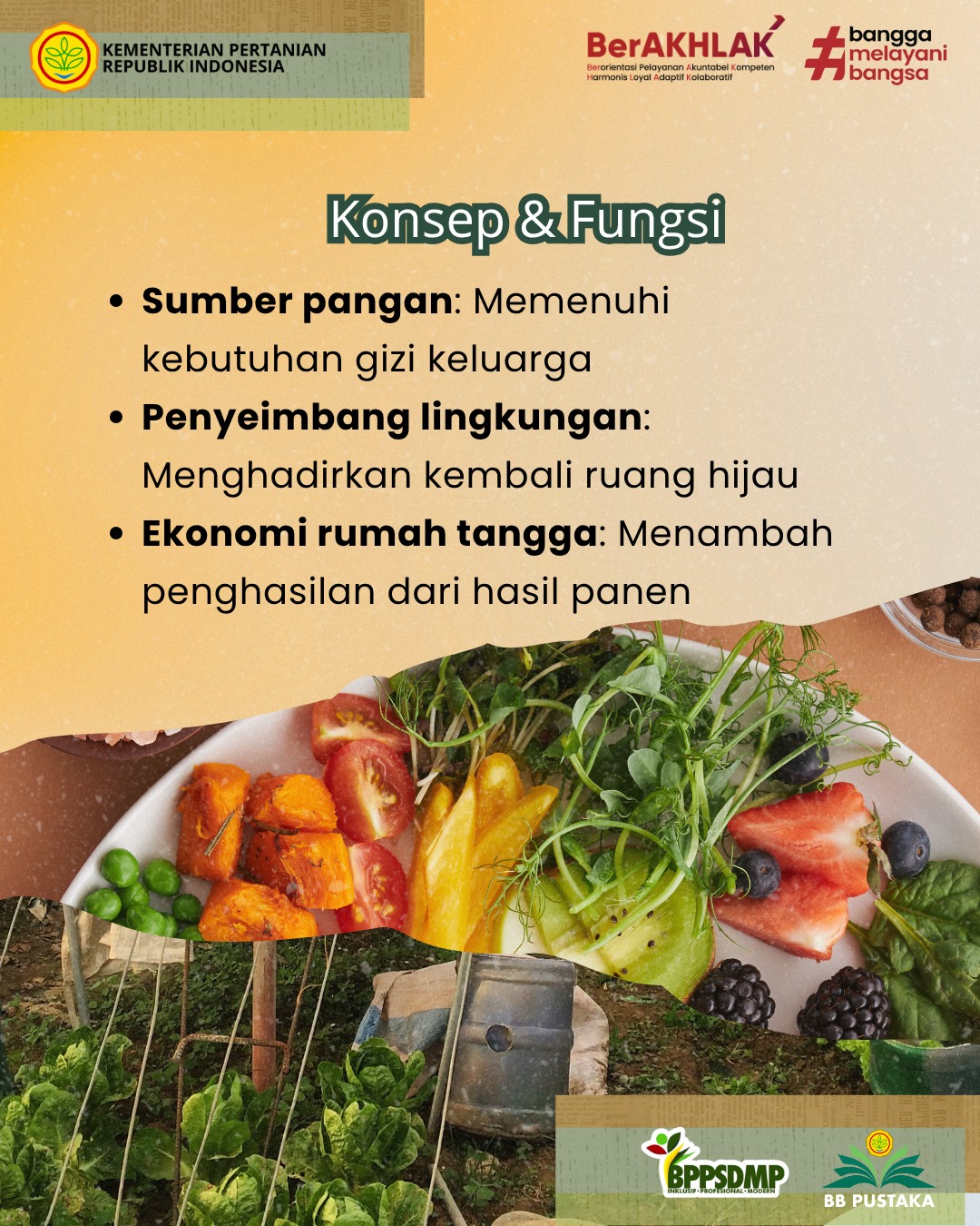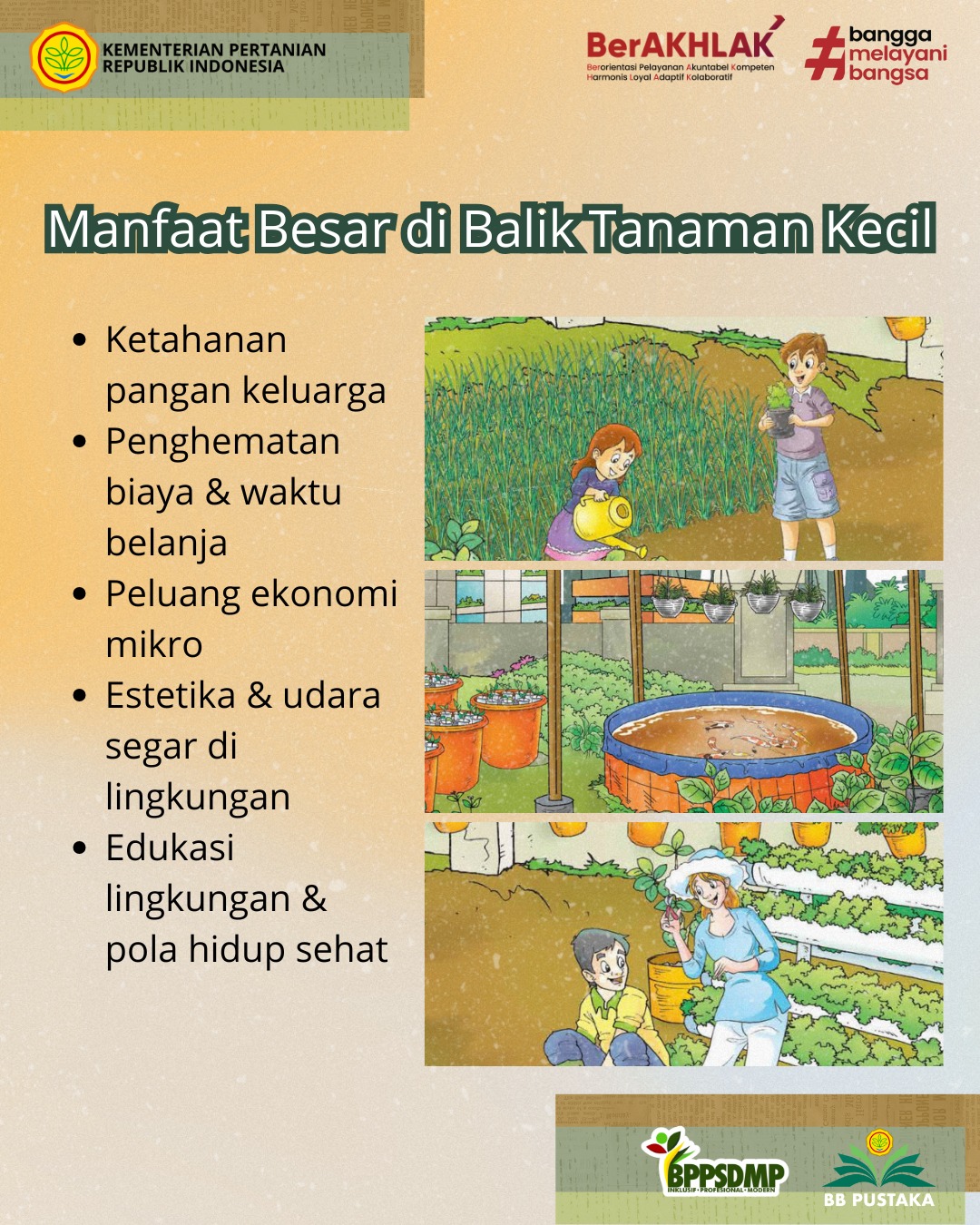 - Ketahanan pangan keluarga. Masyarakat menjadi lebih mandiri dalam memenuhi kebutuhan pangan, khususnya sayur dan rempah harian.