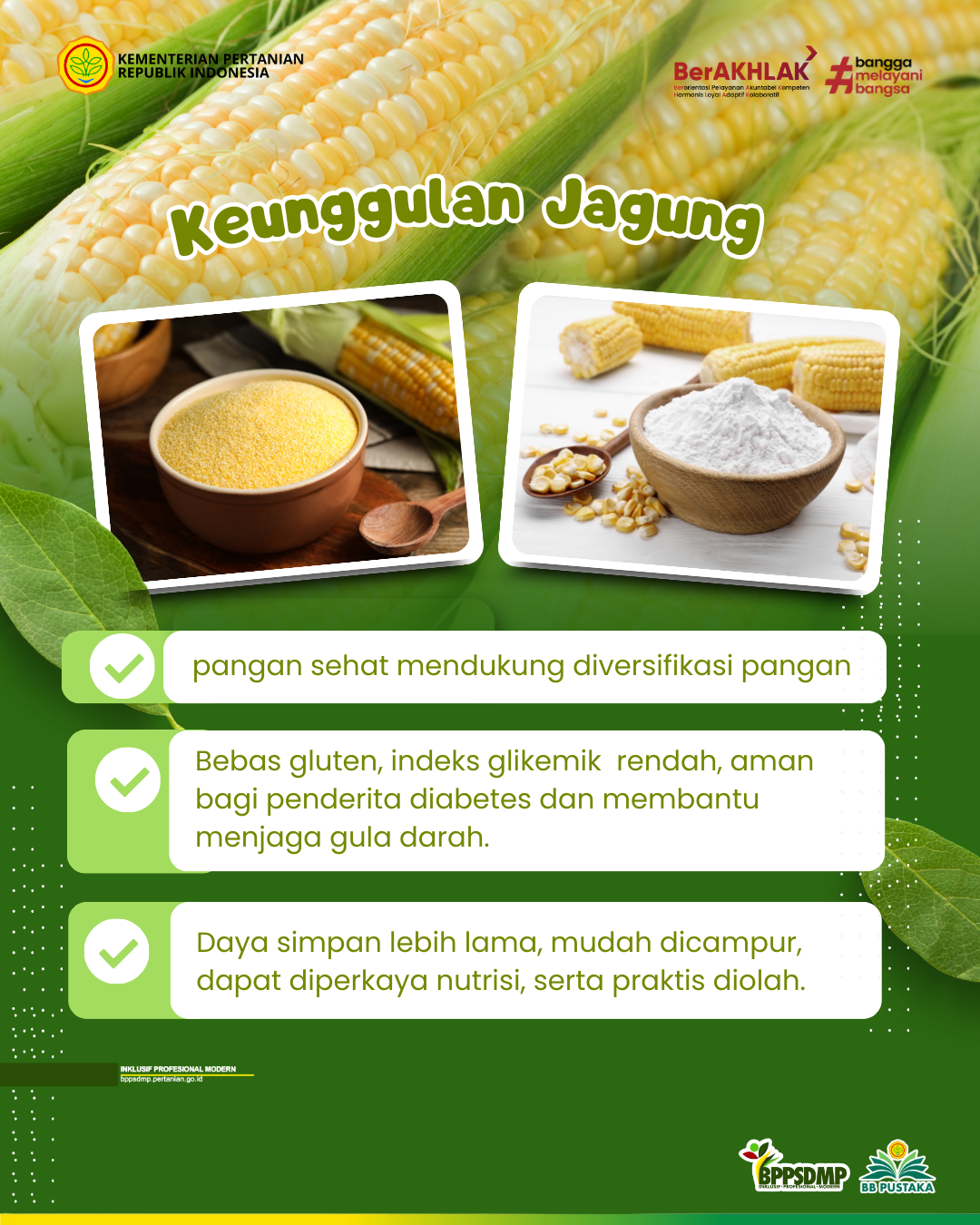 Dari sisi kesehatan, tepung jagung juga unggul yaitu bebas gluten, sehingga cocok untuk dikonsumsi oleh penderita gluten intolerant. Selain itu, produk berbahan dasar jagung memiliki indeks glikemik lebih rendah dibanding beras, membuatnya aman dikonsumsi oleh penderita diabetes atau mereka yang ingin menjaga kadar gula darah tetap stabil.