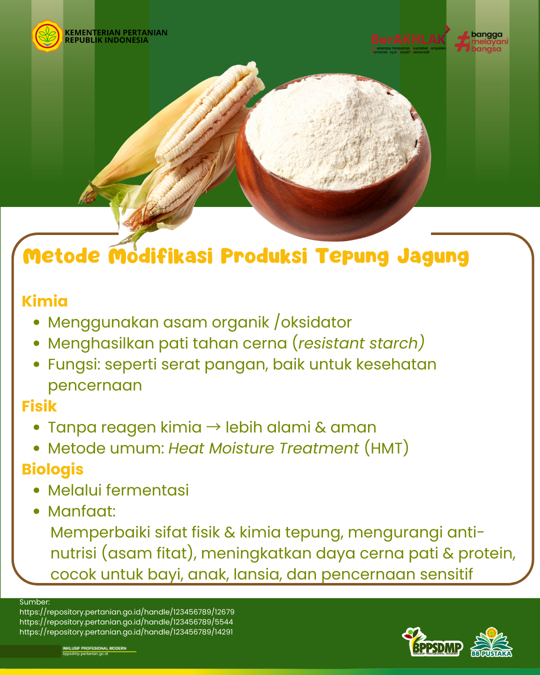https://repository.pertanian.go.id/handle/123456789/12679 - Kementerian Pertanian. (2018). Tepung jagung instan. Buku 600 teknologi. IAARD Press. Badan Penelitian dan Pengembangan Pertanian.