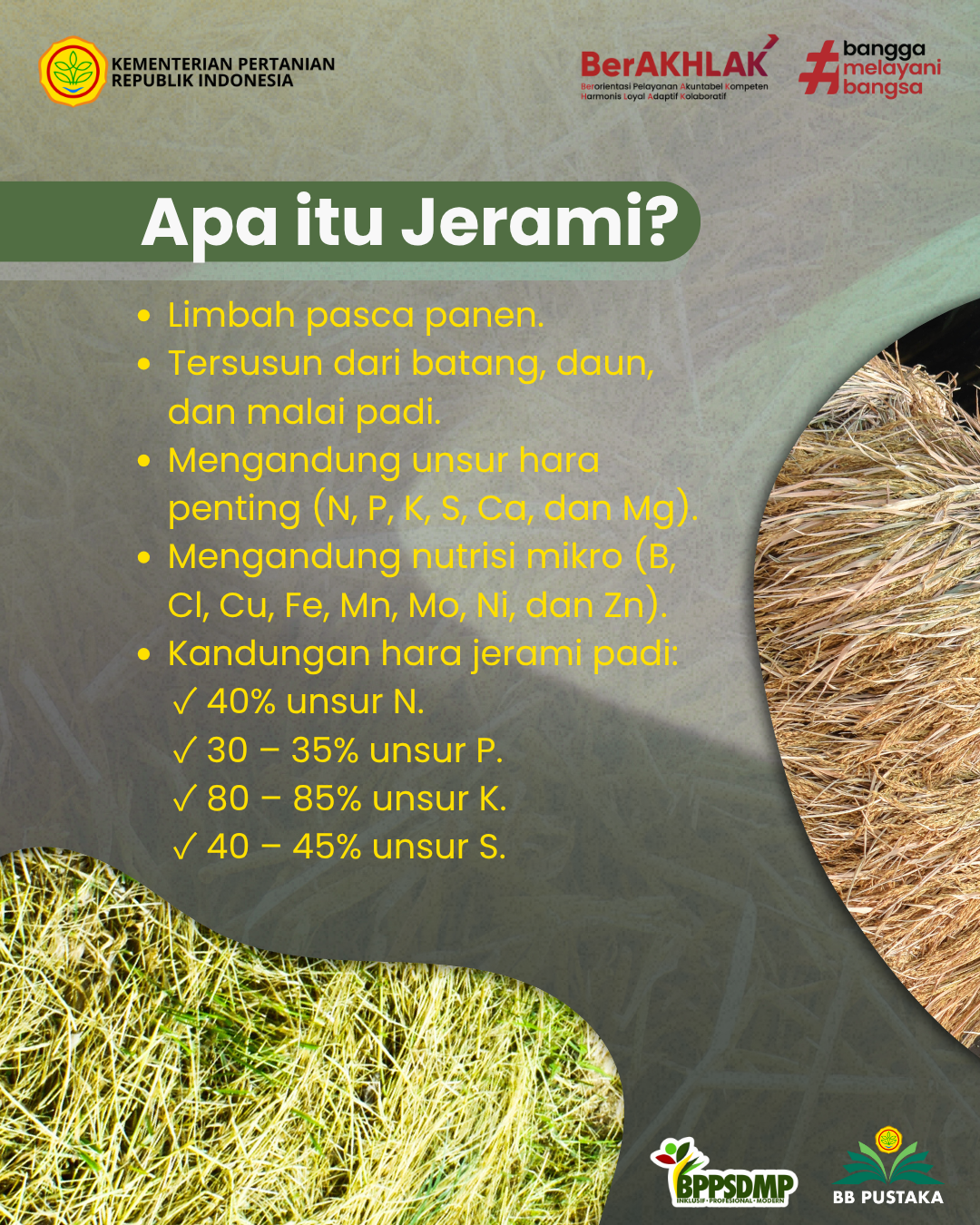 Jerami padi kerap dipandang sebelah mata. Demi efisiensi dan kebiasaan turun-temurun, petani lebih memilih membakarnya untuk membersihkan lahan. Padahal, tindakan ini justru menghilangkan potensi besar jerami dalam memperkaya tanah dan memulihkan ekosistem mikro di dalamnya. Tersusun dari batang, daun, dan malai padi, jerami sebenarnya mengandung beragam unsur hara penting diantaranya N, P, K, S, Ca, dan Mg. Adapun nutrisi mikronya adalah B, Cl, Cu, Fe, Mn, Mo, Ni, dan Zn. Kandungan hara dalam jerami padi mencakup 40% unsur N, 30 – 35% unsur P, 80 – 85% unsur K, dan 40 – 45% unsur S.