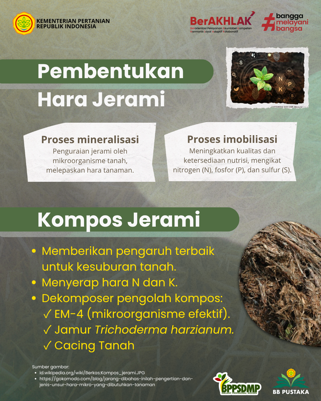 Kandungan hara dalam jerami muncul berkat kerja mikroorganisme tanah. Proses alami seperti mineralisasi dan imobilisasi membantu melepaskan atau mengikat unsur hara penting seperti nitrogen (N), fosfor (P), dan sulfur (S). Menariknya, jerami segar dan jerami yang sudah membusuk (terdekomposisi) punya kandungan hara yang berbeda. Agar manfaatnya maksimal, jerami bisa diolah menjadi kompos dengan bantuan dekomposer seperti EM-4 (mikroorganisme efektif), jamur Trichoderma harzianum, atau cacing tanah. Setelah melalui proses ini, jerami berubah menjadi kompos yang kaya nutrisi dan sangat baik untuk menyuburkan tanah.