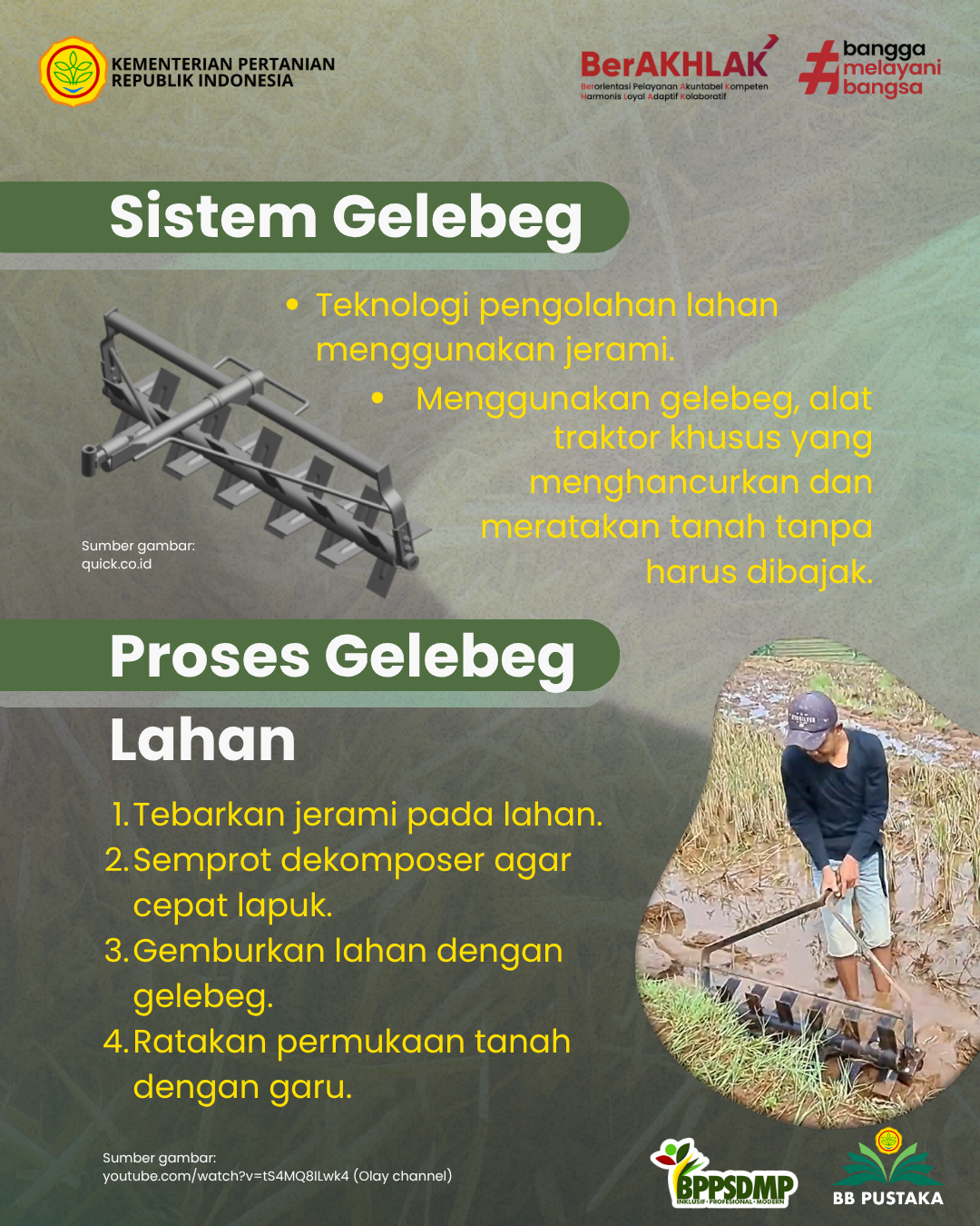 Salah satu teknologi pengolahan lahan yang cocok untuk jerami adalah sistem gelebeg. Pada sistem ini, jerami ditebarkan di lahan, lalu disemprot dekomposer agar cepat lapuk. Setelah itu, lahan digemburkan dengan gelebeg yaitu alat traktor khusus yang menghancurkan dan meratakan tanah tanpa harus dibajak. Garu digunakan setelahnya untuk meratakan permukaan. Dengan cara ini, jerami tidak hanya jadi pupuk alami, tapi juga membantu meningkatkan kesuburan tanah secara praktis dan ramah lingkungan