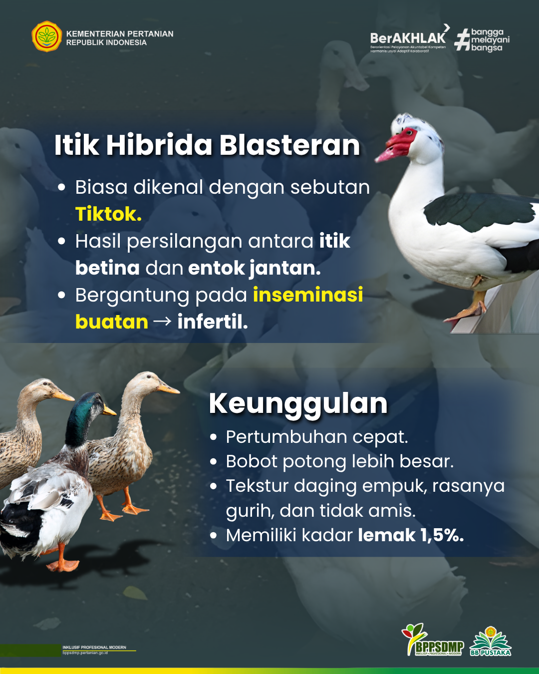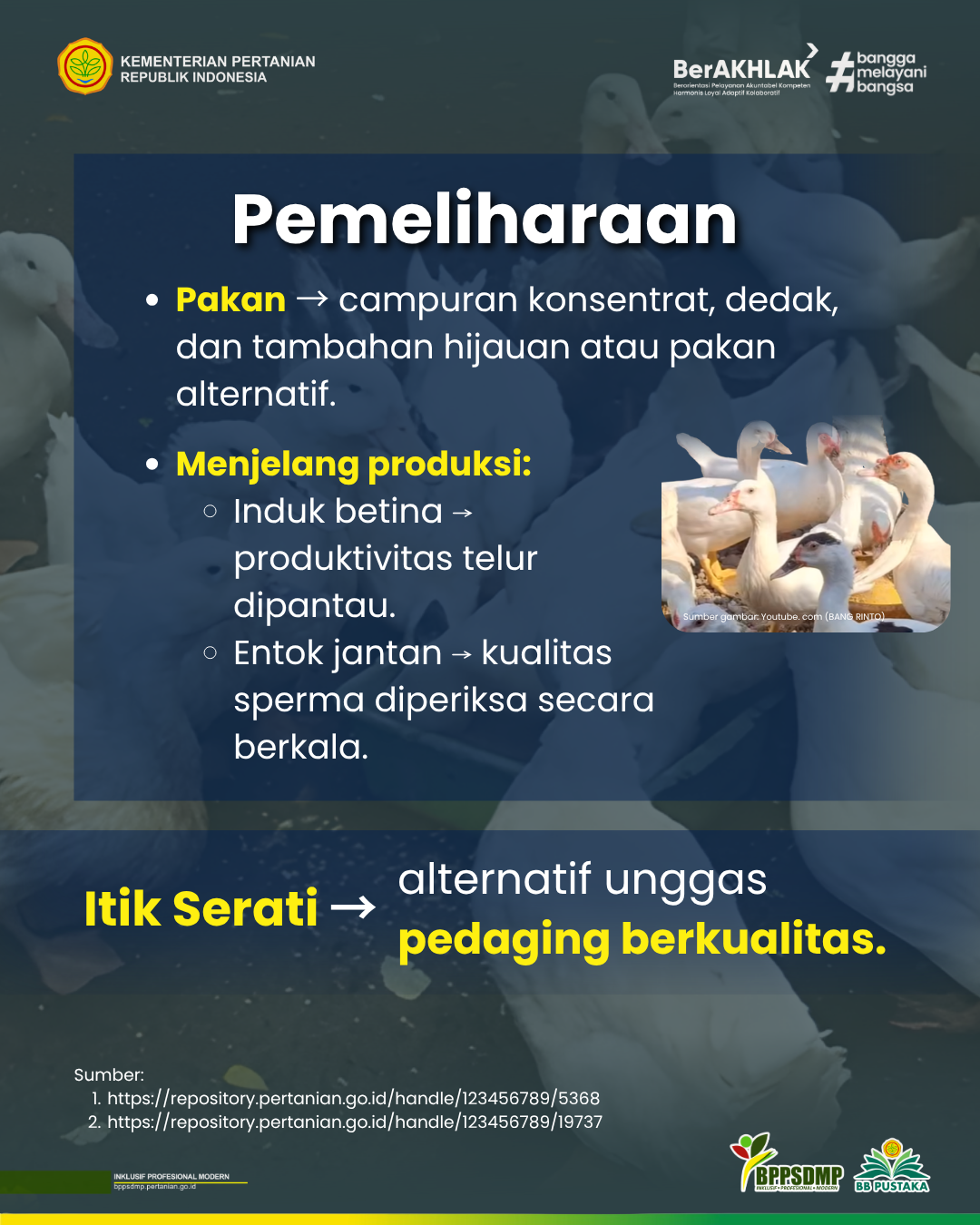 - Balai Pengkajian Teknologi Pertanian Banten. (2010). Budidaya domba dan itik serati (tiktok). Balai Pengkajian Teknologi Pertanian Banten.