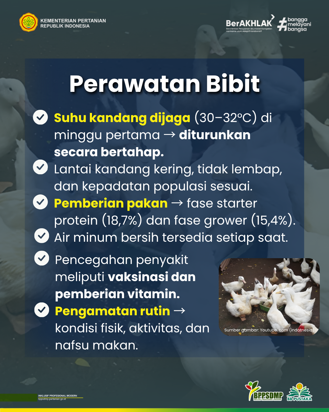 Bibit itik Serati yang baru menetas memerlukan penanganan intensif, terutama pada fase awal (brooding). Beberapa hal penting dalam perawatan bibit: