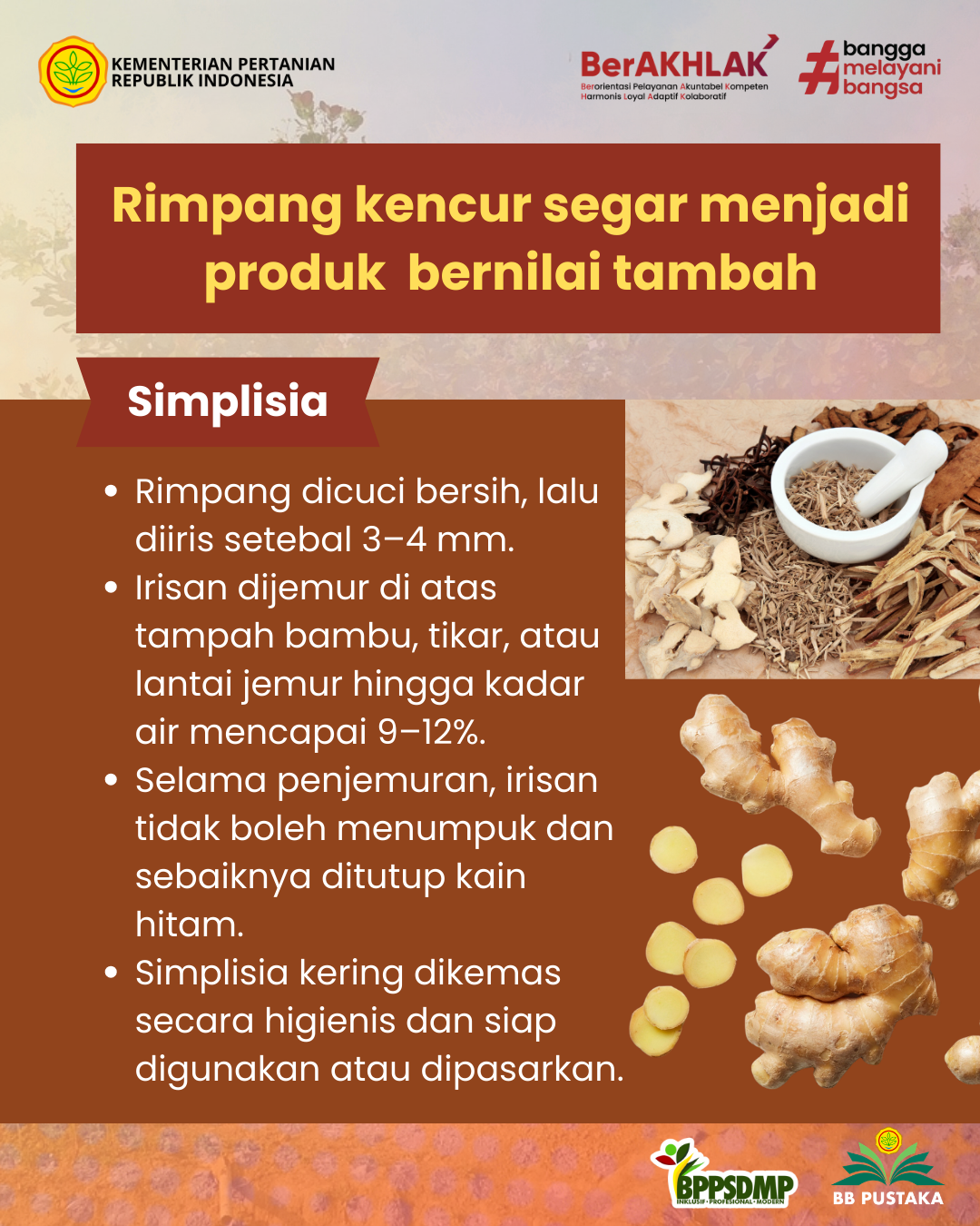 - Rimpang dicuci bersih, lalu diiris setebal 3–4 mm.