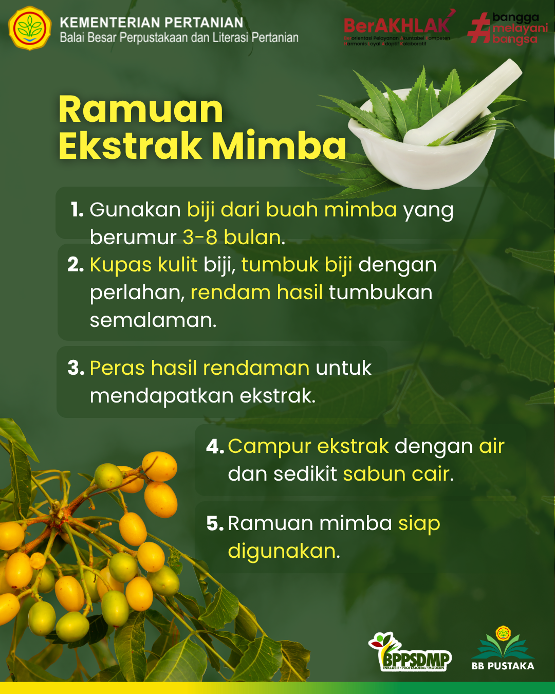Mimba (Azadirachta indica) adalah pohon ajaib yang menawarkan banyak manfaat. Daun dan biji mimba menyimpan zat bioaktif yang mampu melawan gangguan serangga dan melindungi manusia. Mimba telah digunakan dalam sistem pengobatan Ayurveda di India sebagai antiseptik alami, penurun panas, dan pembersih darah. Dalam dunia pertanian dan kesehatan mimba digunakan sebagai pestisida organik yang multifungsi. Mimba sebagai pestisida memiliki keunggulan alami karena mudah terurai, aman bagi manusia, dan tidak merusak keseimbangan ekosistem.