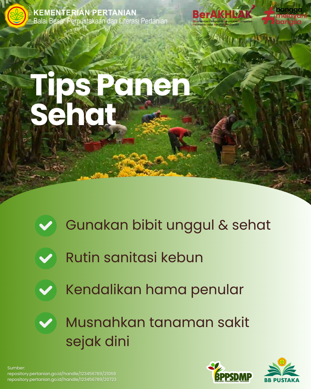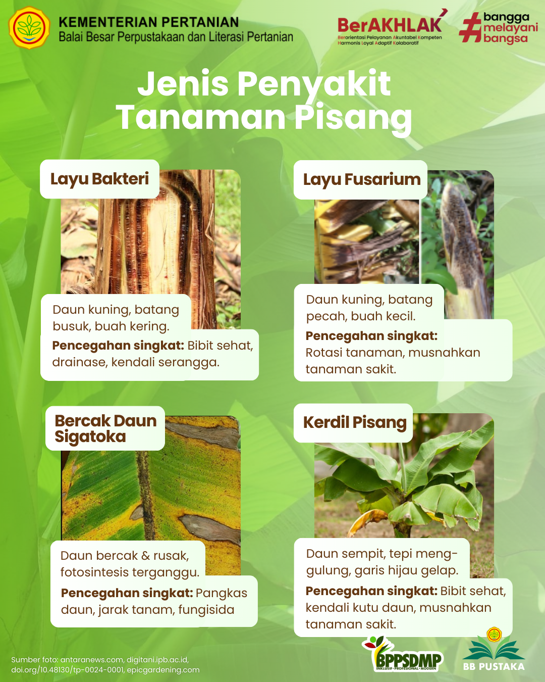 Tidak serumit yang dibayangkan, penyakit tanaman pisang dapat dicegah sedini mungkin melalui bibit unggul dan sanitasi lahan. Pisang sehat tidak hanya menghasilkan panen hebat, sebagai buah favorit masyarakat produksi pisang juga menjadi penopang ekonomi dan gizi masyarakat. Mengenal penyakit pada tanaman pisang dan memahami pengendaliannya adalah bentuk kesigapan dalam menjaga produksi pisang yang sehat, produktif, serta berkelanjutan. (AM’2025)
