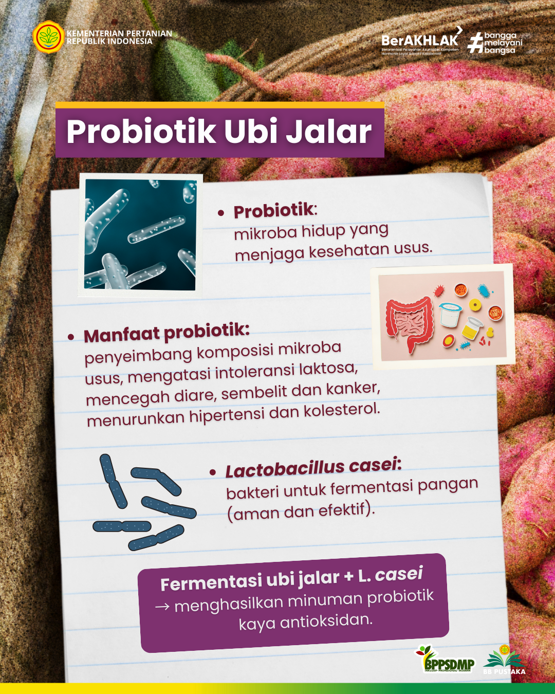 Probiotik adalah suplemen pangan dengan mikroba hidup. Mikroba probiotik dapat bertahan hidup dalam saluran pencernaan dan berperan sebagai penyeimbang komposisi mikroba dalam usus, mengatasi intoleransi laktosa, serta mencegah diare, sembelit, kanker, hipertensi, dan menurunkan kolesterol. Ubi jalar dapat dikombinasikan dengan bakteri Lactobacillus casei —bakteri yang terbukti aman dan efektif dalam fermentasi pangan. Proses fermentasi ini menggunakan sari ubi jalar dan akan menghasilkan produk berupa minuman probiotik.