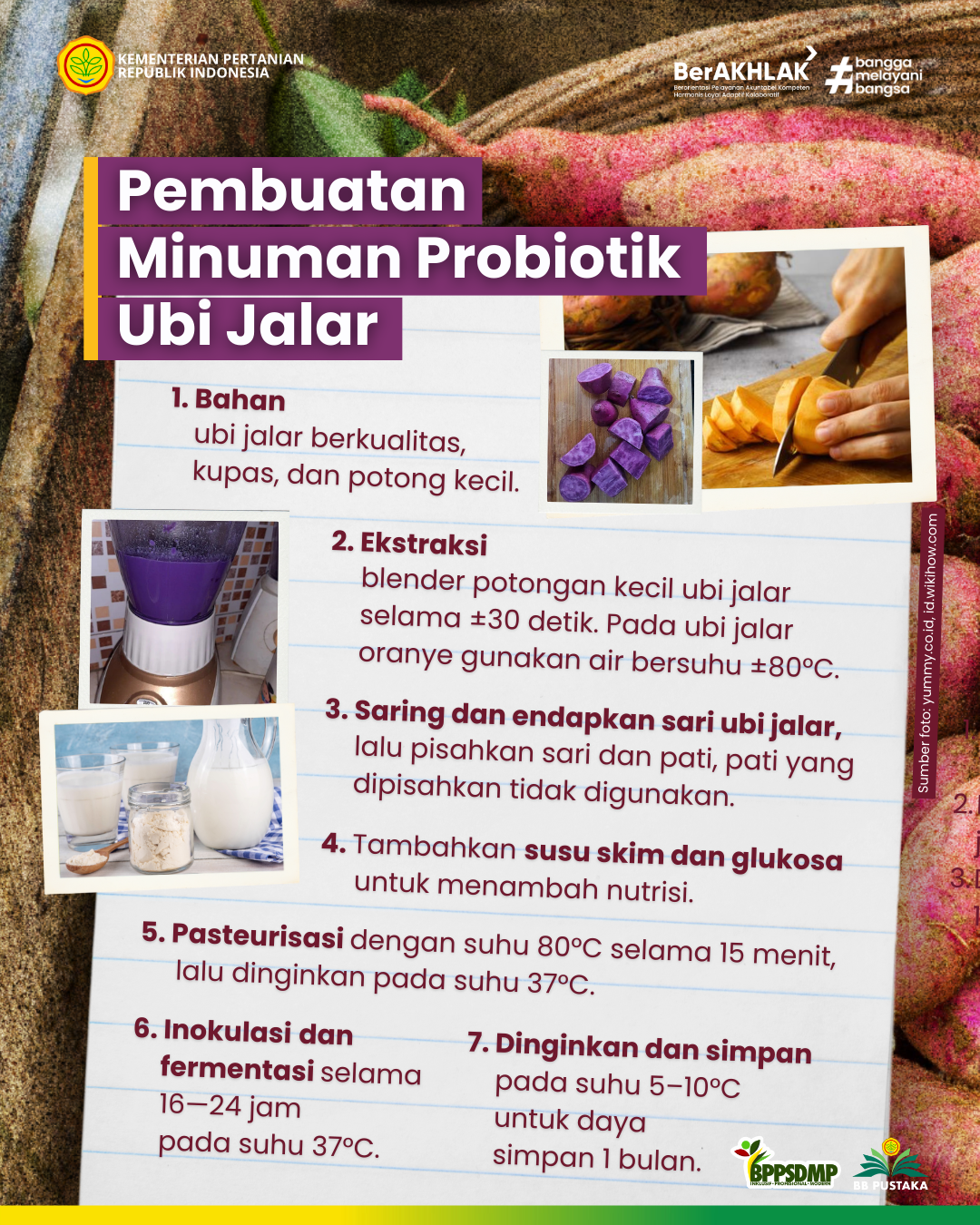 Minuman probiotik sari ubi jalar menggunakan ubi jalar oranye dan ubi jalar ungu. Ubi jalar yang digunakan bermutu baik. Sari ubi jalar diproses menggunakan air bersih dengan suhu normal (ubi jalar ungu) dan suhu ±800C (ubi jalar oranye). Produk olahan ubi jalar ini memerlukan susu skim sebagai media tumbuh bakteri.