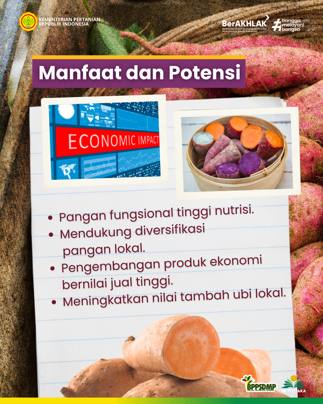 Tidak hanya bermanfaat sebagai sumber gizi dan energi, ubi jalar menjelma menjadi pangan fungsional bernilai tinggi. Kombinasi unik ubi jalar dan probiotik adalah inovasi yang bermanfaat untuk kesehatan, bentuk nyata diversifikasi pangan lokal, hingga peluang ekonomi menjanjikan. Ubi jalar kini adalah komoditas strategis pangan lokal bernilai global. (AM’2025)