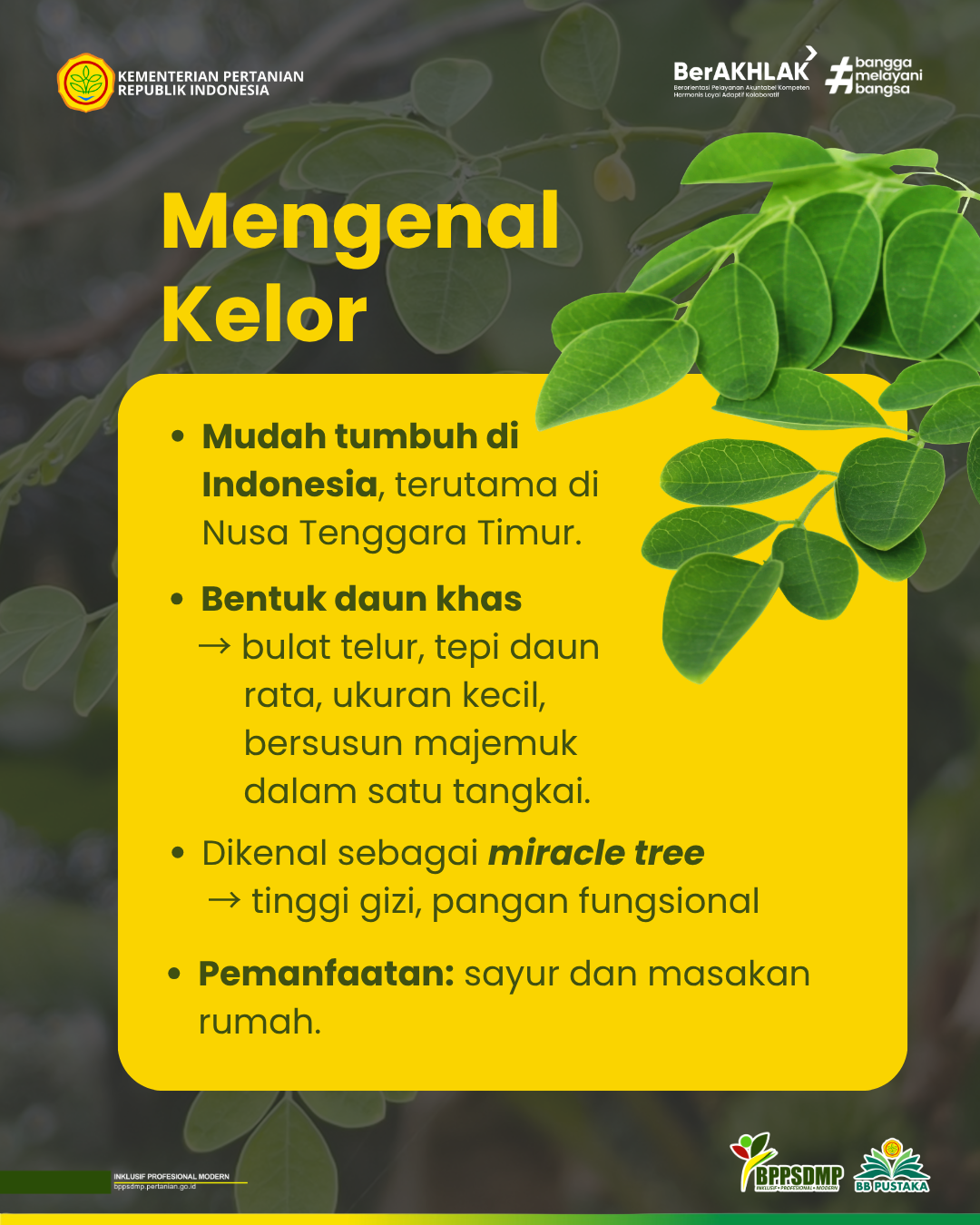Kelor sendiri bukan tanaman asing bagi masyarakat Indonesia, terutama di wilayah timur, Nusa Tenggara Timur. Tanaman ini tumbuh dengan mudah dan sejak lama dimanfaatkan dalam kehidupan sehari-hari. Bentuk daun kelor bulat telur dengan tepi daun rata dan ukurannya kecil bersusun majemuk dalam satu tangkai. Meski tampilannya sederhana, daun kelor menyimpan kandungan gizi yang luar biasa sehingga kelor sering dijuluki miracle tree. Sayangnya, pemanfaatannya masih cenderung terbatas, umumnya diolah sebagai sayur bening atau masakan rumahan.
