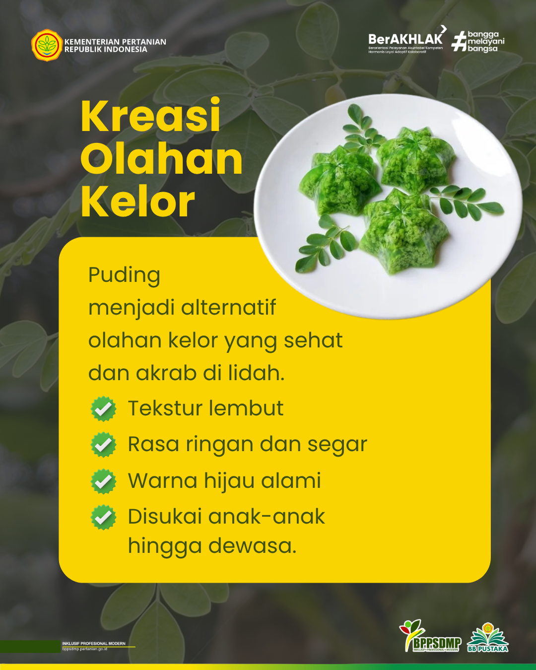 Selama ini puding dikenal sebagai hidangan penutup yang manis, lembut, dan hampir selalu jadi favorit di berbagai kesempatan. Cara membuatnya simpel, bahannya fleksibel, dan gampang dikreasikan sesuai selera. Kini, puding bukan hanya sebagai hidangan penutup, tetapi juga mulai dikembangkan sebagai pangan fungsional yang kaya manfaat. Salah satunya adalah dengan memanfaatkan daun kelor sebagai bahan utama puding.