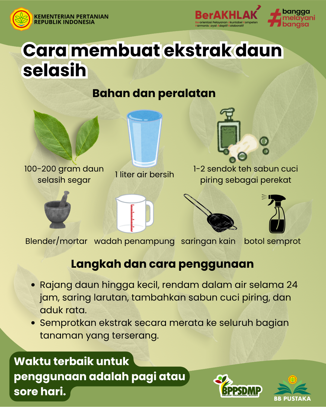 Untuk membuat larutan pestisida nabati dari daun selasih, diperlukan beberapa bahan dan peralatan. Bahan utama yang digunakan adalah daun selasih segar sebanyak 100–200 gram atau sekitar satu genggam penuh, 1 liter air bersih, dan sabun cuci piring sebanyak 1–2 sendok teh sebagai bahan opsional yang berfungsi sebagai perekat agar larutan dapat menempel lebih baik pada permukaan daun saat diaplikasikan.