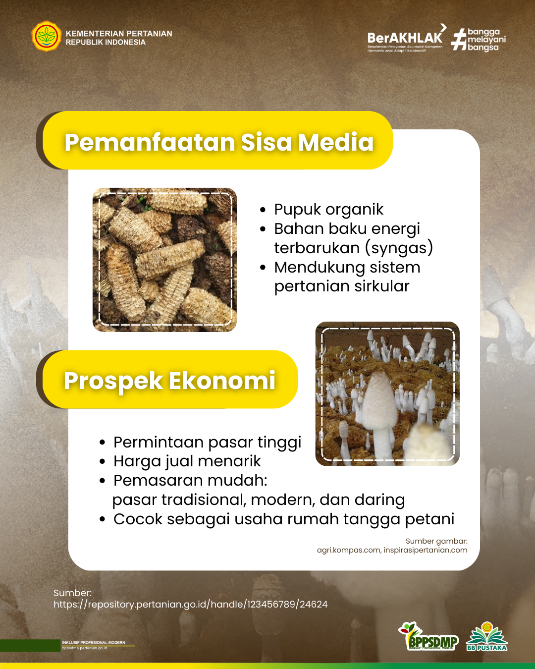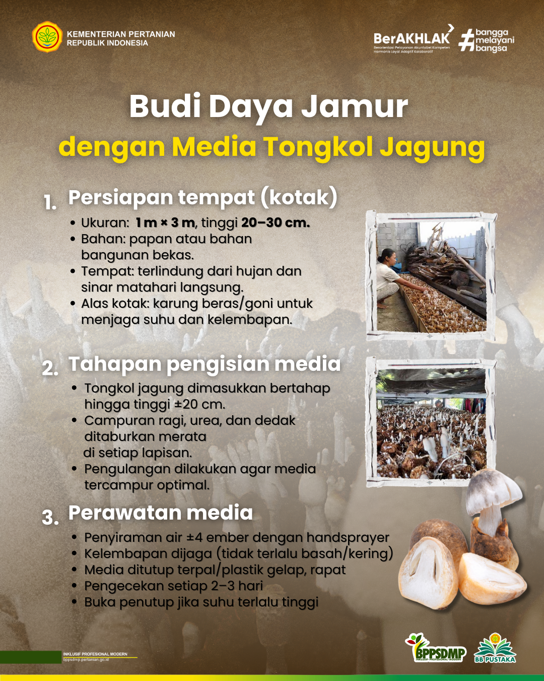 Jagung merupakan komoditas pangan strategis di Indonesia yang kaya karbohidrat, protein, serta berbagai komponen gizi penting lainnya. Selain sebagai bahan pangan, jagung juga dimanfaatkan untuk pakan ternak, bahan baku industri, dan bioenergi. Namun, limbah budi daya jagung seperti tongkol, batang, dan klobot yang jumlahnya mencapai 20–30% dari total produksi masih belum dikelola secara optimal. Padahal, limbah tersebut berpotensi dimanfaatkan sebagai media tanam jamur yang mudah diterapkan, berbiaya rendah, bahan dan alatnya sederhana, dan mampu memberikan nilai tambah serta meningkatkan pendapatan petani.