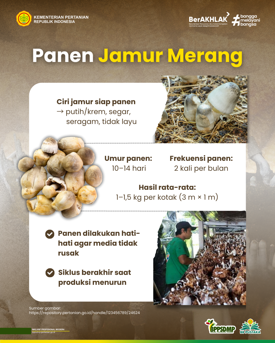 Panen. Ciri-ciri jamur merang siap panen memiliki ukuran seragam, bentuk seperti pentol korek api namun lebih besar, berwarna putih/ krem bersih, segar, dan tidak layu. Masa panen jamur merang bervariasi 10–14 hari tergantung dari kondisi media, kelembapan, dan faktor lingkungan lainnya. Pemanenan dilakukan secara perlahan dan hati-hati menggunakan pisau, gunting, atau tangan dengan cara memotong atau mencabut jamur tanpa merusak media tumbuh jamur merang yang masih kecil, kemudian ditempatkan pada wadah yang bersih.