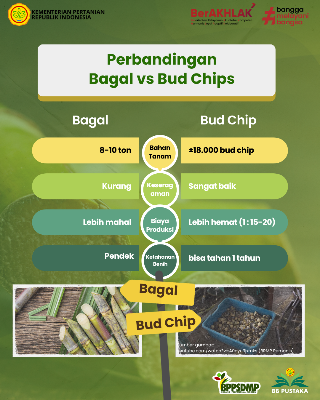 Untuk percepatan penyediaan bahan tanam tebu, perlu inovasi perbanyakan benih tebu dengan menggunakan bahan tanam mata tunas tebu yang ditumbuhkan terlebih dahulu. Hasil benih yang berasal dari mata tunas tebu sering disebut sebagai benih bud chips atau single bud planting atau benih tumbuh. Bud chips dapat memperbaiki kualitas bibit tebu karena seleksi bibit sehat dan seragam dilakukan sejak awal. Penyebaran hama dan penyakit tebu ke luar daerah dapat dikurangi karena bibit bud chips diperlakukan dengan pestisida dan hot water treatment (HWT). Keunggulan penggunaan benih tebu bud chips, satu mata tunas dapat membentuk 8–12 batang/rumpun, setara 50-60 mata tunas benih bud chips.