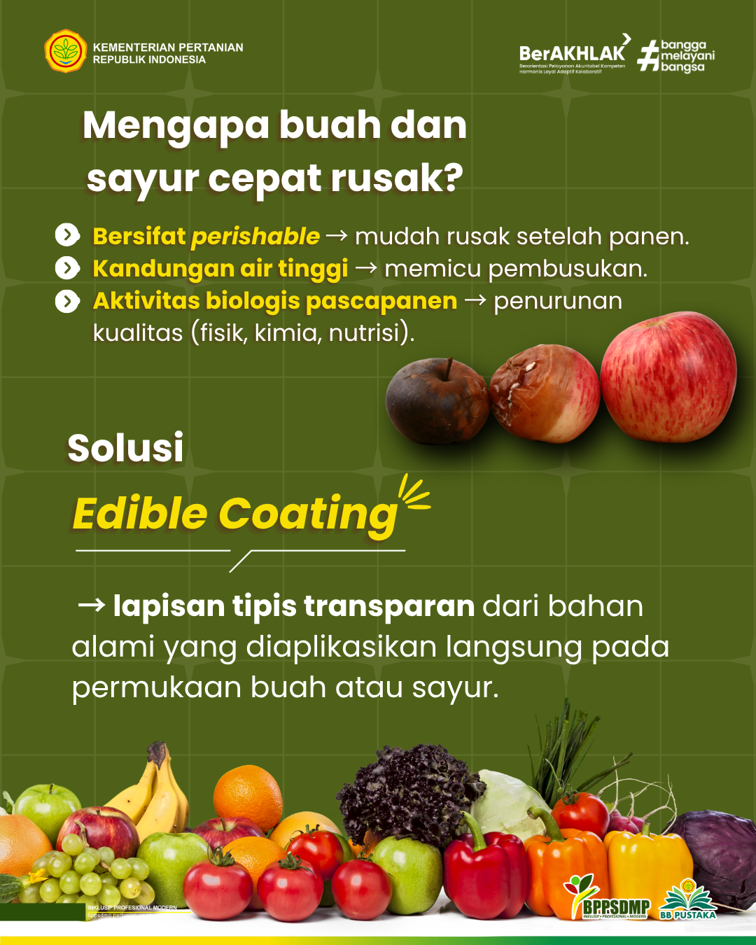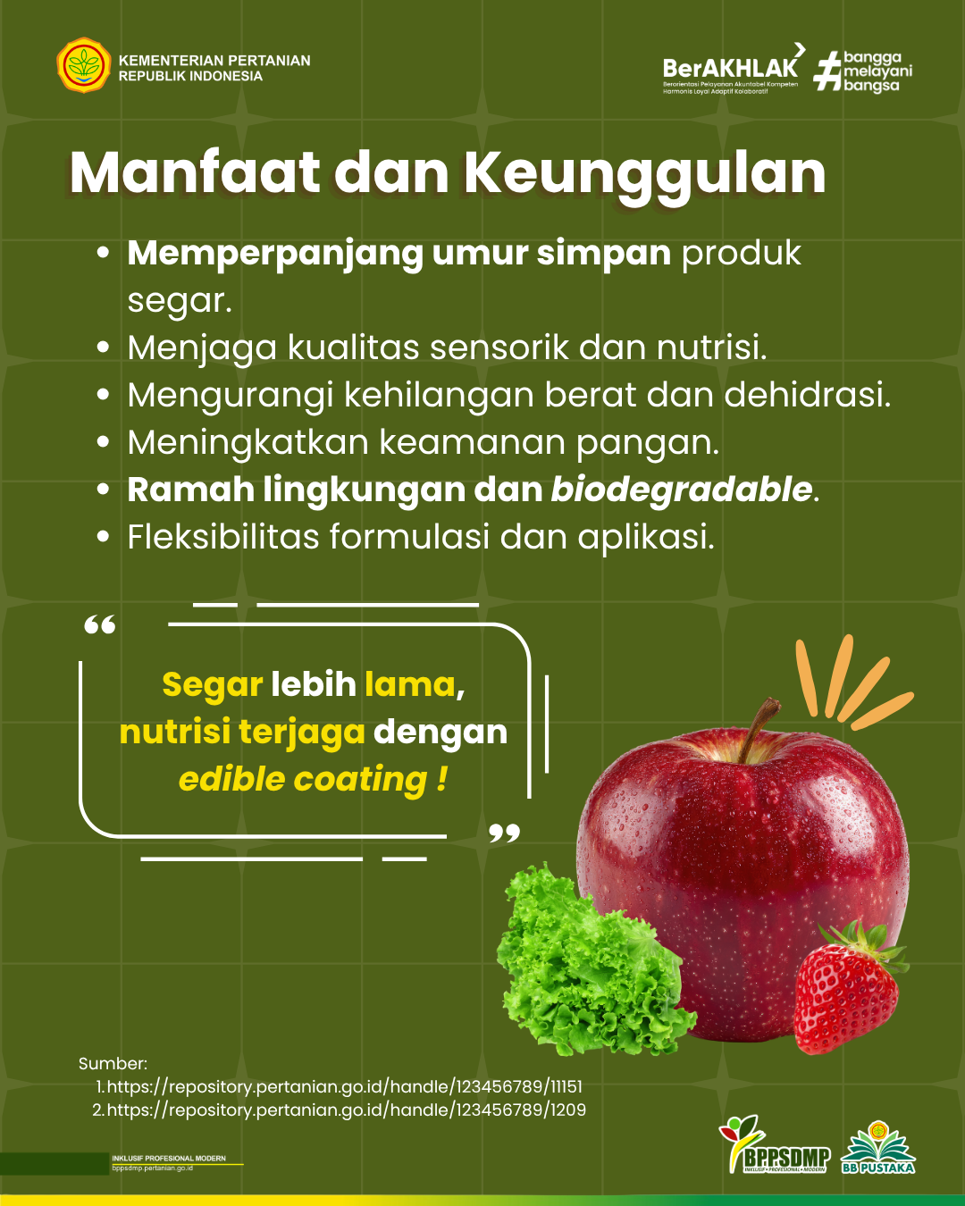 Pemanfaatan edible coating menjadi salah satu langkah inovatif untuk mempertahankan kualitas buah dan sayur setelah panen. Selain efektif, edible coating juga aman dikonsumsi dan ramah lingkungan. Penerapan teknologi ini berpotensi menjadi solusi praktis untuk mengurangi kehilangan hasil pascapanen serta memainkan peran penting dalam menghadapi tantangan ketahanan pangan di masa depan. (QAR, 2025).