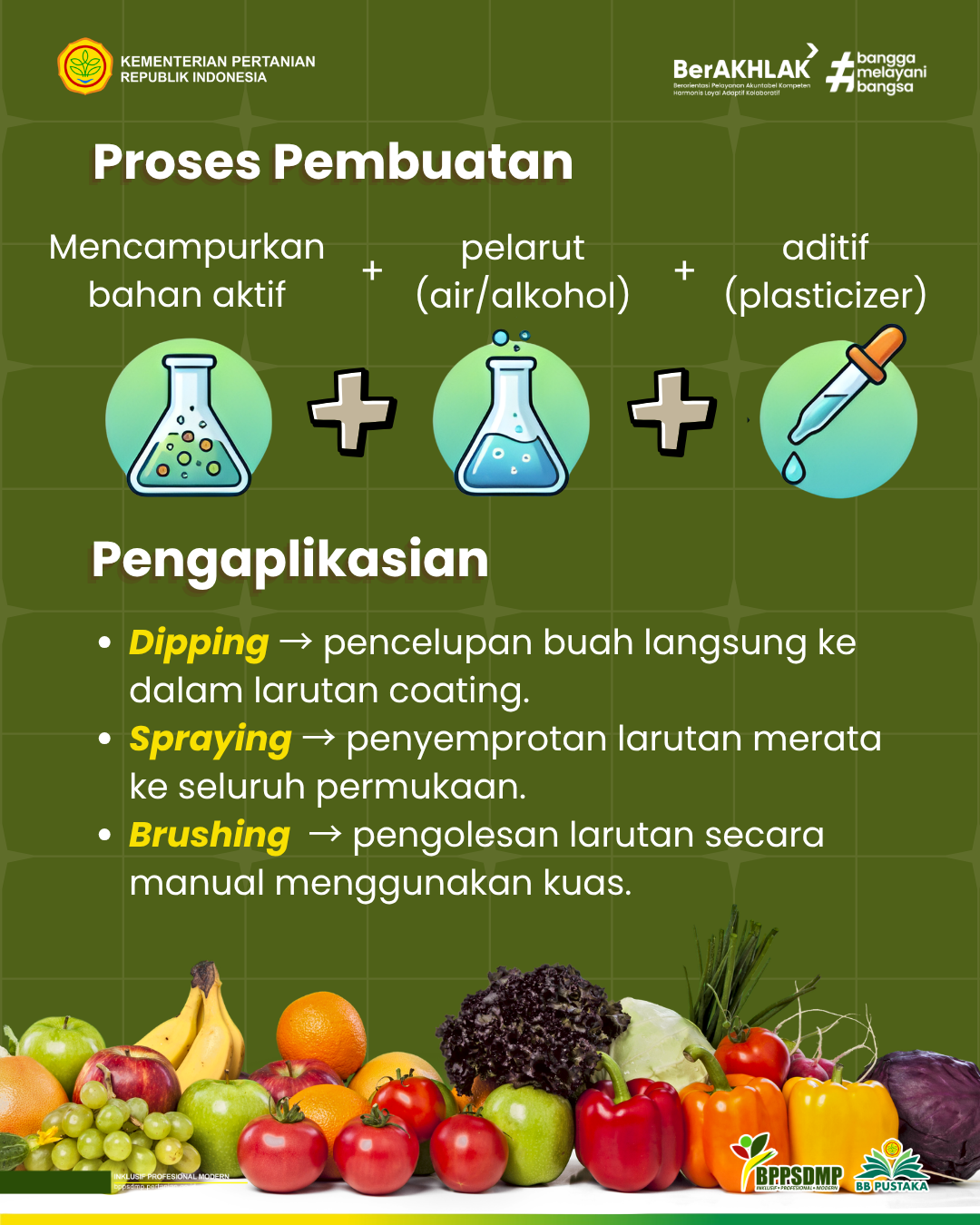 Pembuatan edible coating melibatkan pencampuran bahan aktif dengan pelarut (seperti air atau alkohol) serta aditif (misalnya plasticizer untuk meningkatkan fleksibilitas). Campuran ini kemudian diaplikasikan ke permukaan buah atau sayur melalui beberapa metode, yaitu: