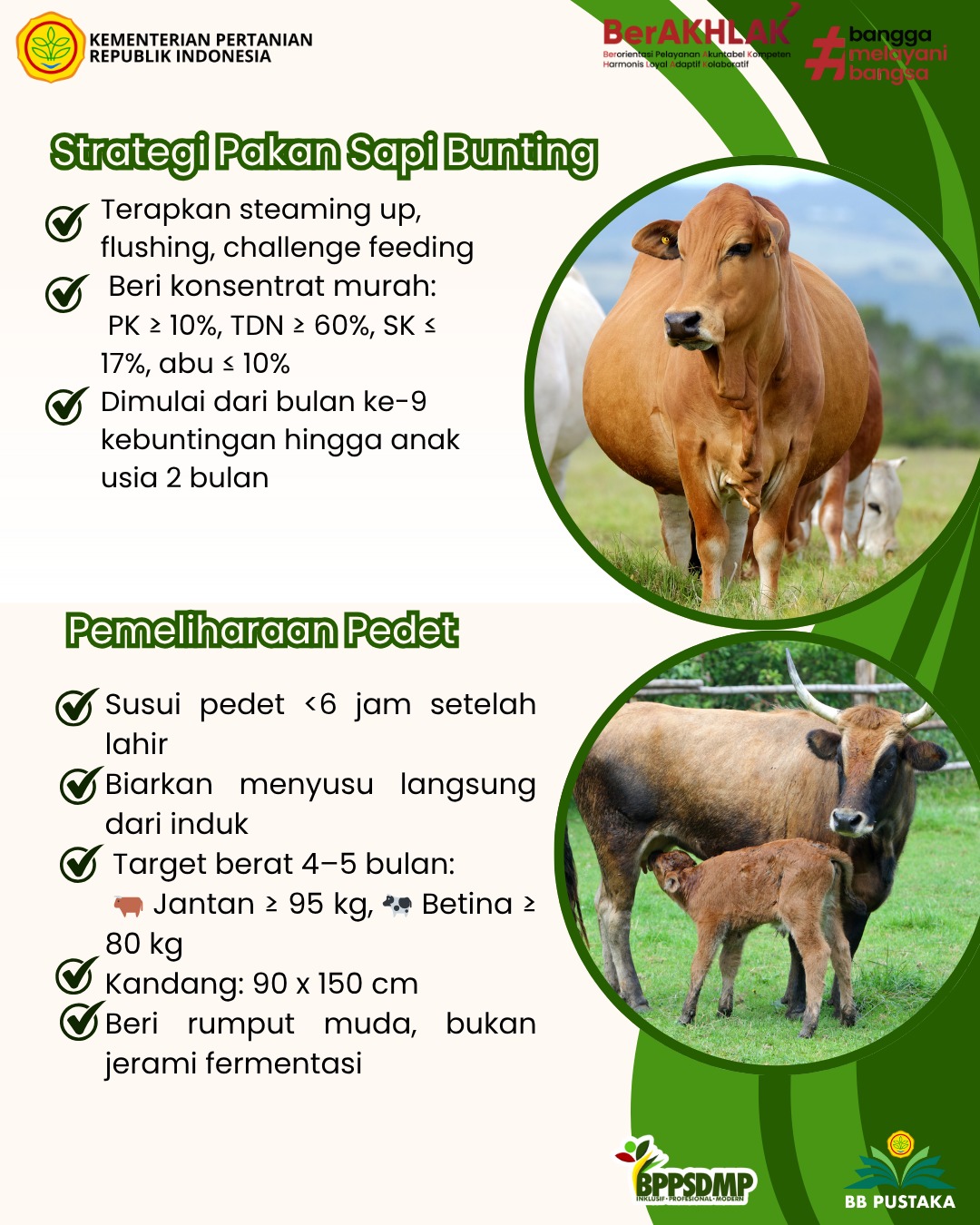 Pemeliharaan Pedet: 1) pedet yang baru dilahirkan harus segera disusukan pada induknya sebelum 6 jam setelah dilahirkan, 2) pedet dapat terus meneruskan dikumpulkan dengan induknya agar dapat menyusui setiap saat, 3) target kinerja dari pemeliharaan pedet pada umur 4-5 bulan,minimal 95 kg untuk sapi jantan sedang yang betina 80 kg, 4)ukuran luas untuk kandang pedet pra sapih 90 x 150 cm, 5) pedet pra sapih jangan diberikan jerami padi fermentasi tapi rumput muda baik rumput lapang atau rumput unggul