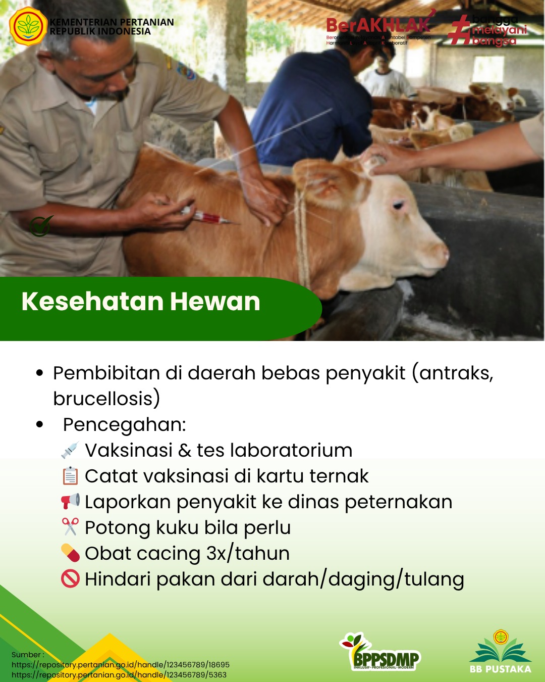 Pencegahan Penyakit Hewan: 1) melakukan vaksinasi dan pengujian/tes laboratorium terhadap penyakit hewan menular tertentu yang ditetapkan oleh instansi berwenang, 2) mencatat setiap pelaksanaan vaksinasi dan jenis vaksin yang dipakai dalam kartu kesehatan ternak, 3) melaporkan kepada dinas yang membidangi peternakan dan kesehatan hewan setempat terhadap kemungkinan timbulnya kasus penyakit, terutama yang diduga/dianggap sebagai penyakit hewan menular, 4) melakukan pemotongan kuku apabila diperlukan, 5) memberikan obat cacing secara rutin tiga kali dalam setahun, 6) memberikan pakan yang tidak mengandung bahan pakan yang berupa darah, daging, dan/atau tulang.