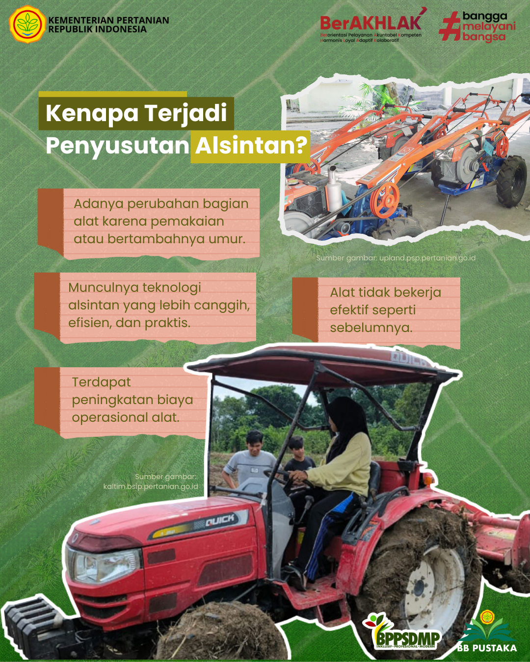 Alsintan telah menjadi bagian penting dalam dunia pertanian modern yang optimal dan efisien. Tidak sekadar pendukung, alsintan sudah menjadi kebutuhan bagi petani dalam mengelola lahan dan usahataninya. Penggunaan alsintan sudah banyak dilakukan dalam kegiatan pertanian mulai dari persiapan lahan, penanaman, pemeliharaan tanaman, hingga panen dan pasca panen.