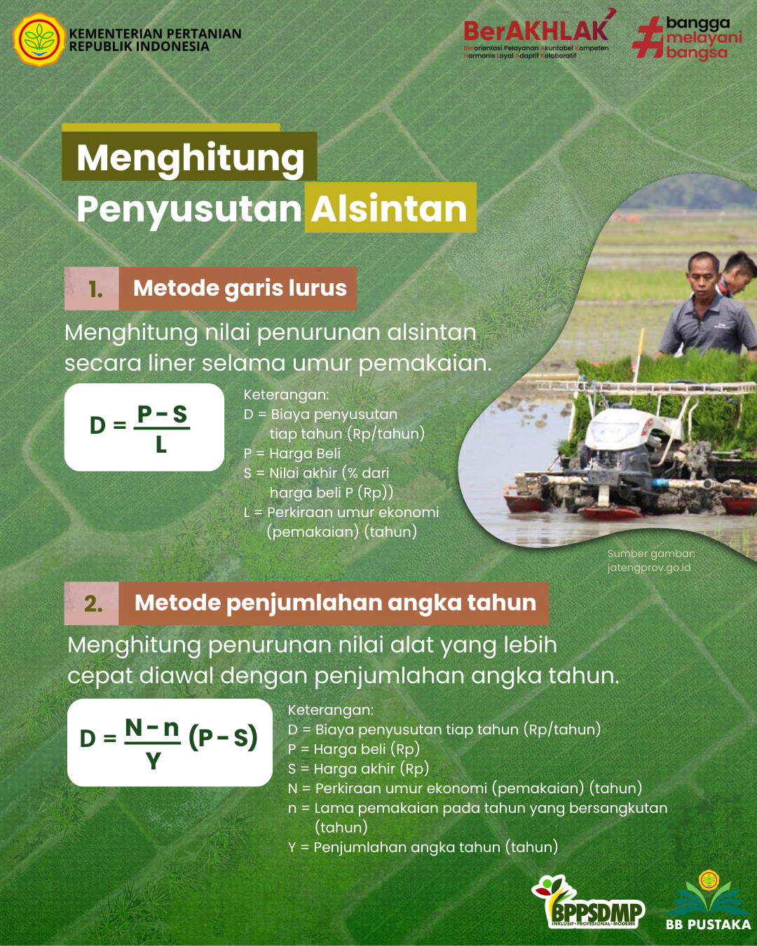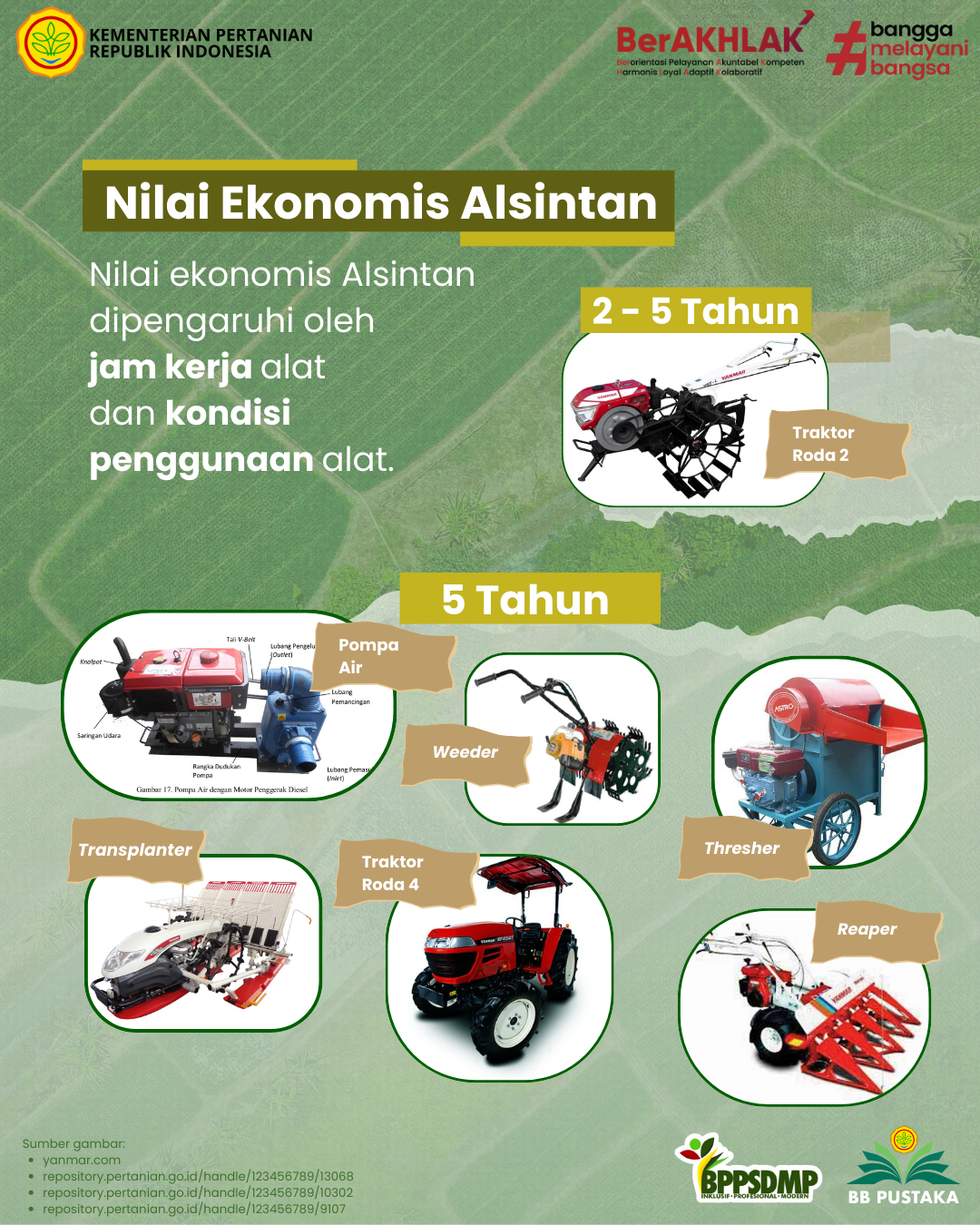 Dalam mendukung swasembada pangan, Kementerian Pertanian bergerak cepat melalui pembentukan Brigade Pangan dan peningkatan ketersediaan mekanisasi pertanian dengan Alsintan (Alat Mesin Pertanian). Mekanisasi pertanian melalui alsintan menciptakan usaha tani yang lebih modern dan efisien. Pemahaman mengenai penggunaan, pemeliharaan, dan bahkan penyusutan alsintan menjadi penting bagi petani dan penyuluh agar pemanfaatan alat dan tujuan mekanisasi menjadi tepat.