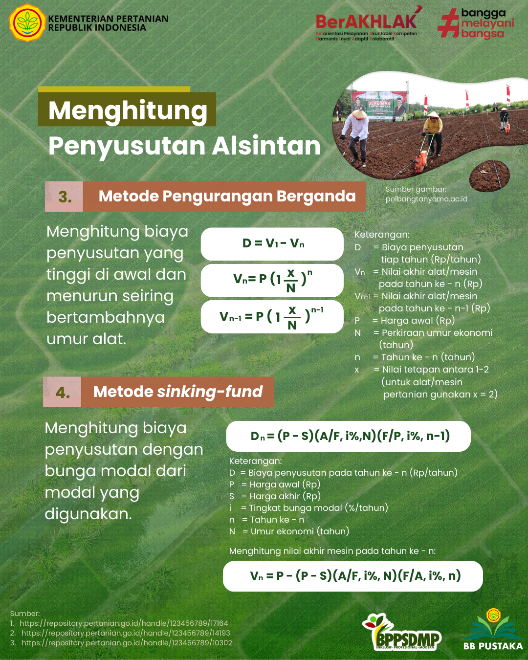 Direktorat Alat dan Mesin. (2001). Pedoman Analisa Ekonomi Alat dan Mesin Pertanian. Jakarta: Direktorat Alat dan Mesin, Direktorat Jenderal Bina Sarana Pertanian. Melly, Sandra, dkk. (2020). MANAJEMEN MESIN PERTANIAN 1 (Kajian Konsep Dasar Manajemen Mesin Pertanian). Sleman: The Journal Publishing.