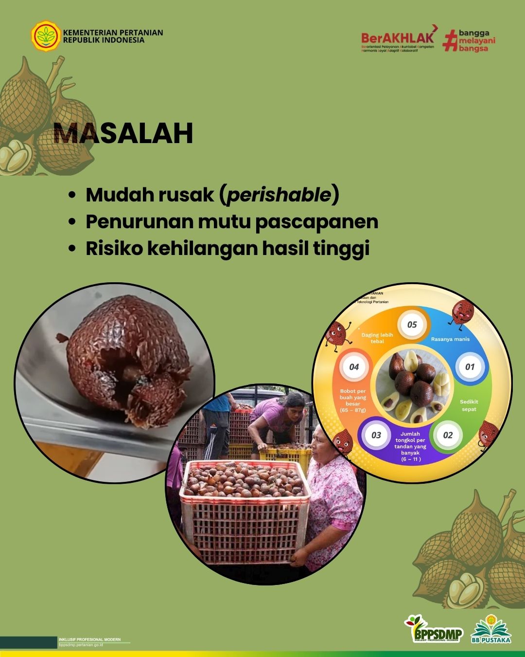 Buah salak merupakan komoditas hortikultura unggulan Indonesia dengan nilai ekonomi tinggi, namun bersifat mudah rusak (perishable). Setelah panen, proses respirasi dan transpirasi menyebabkan penurunan mutu seperti kehilangan air, perubahan tekstur, hingga pembusukan. Hal ini berpotensi menimbulkan kehilangan hasil yang cukup besar, terutama saat distribusi dan penyimpanan.