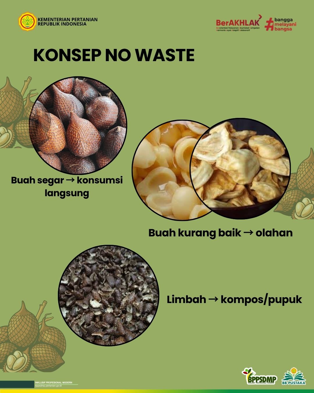 Pendekatan no waste atau tanpa limbah sangat relevan diterapkan pada komoditas salak. Hal ini sejalan dengan konsep bioindustri pertanian yang menekankan pemanfaatan seluruh biomassa dan limbah secara optimal untuk meningkatkan efisiensi dan keberlanjutan.