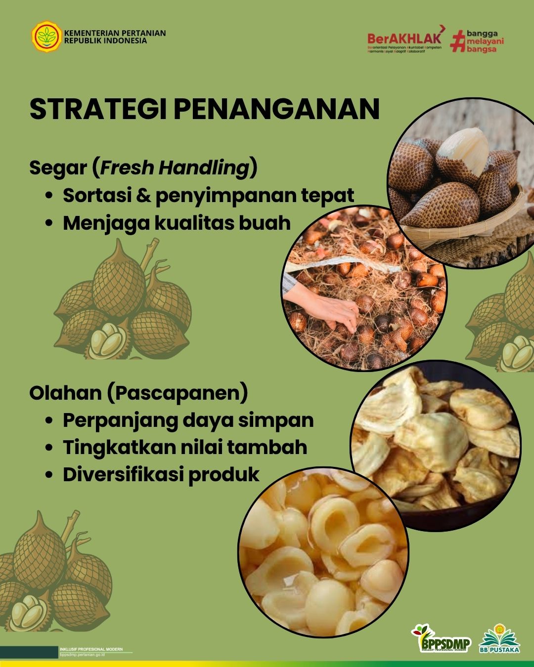 Pengolahan hasil menjadi langkah penting dalam memperpanjang umur simpan sekaligus meningkatkan nilai tambah. Buah salak dapat diolah menjadi berbagai produk seperti manisan, keripik, sari buah, hingga dodol. Produk olahan ini tidak hanya memiliki daya simpan lebih lama, tetapi juga mampu menjangkau pasar yang lebih luas dengan nilai ekonomi yang lebih tinggi. Dengan demikian, buah yang tidak memenuhi standar pasar segar tetap dapat dimanfaatkan secara optimal.