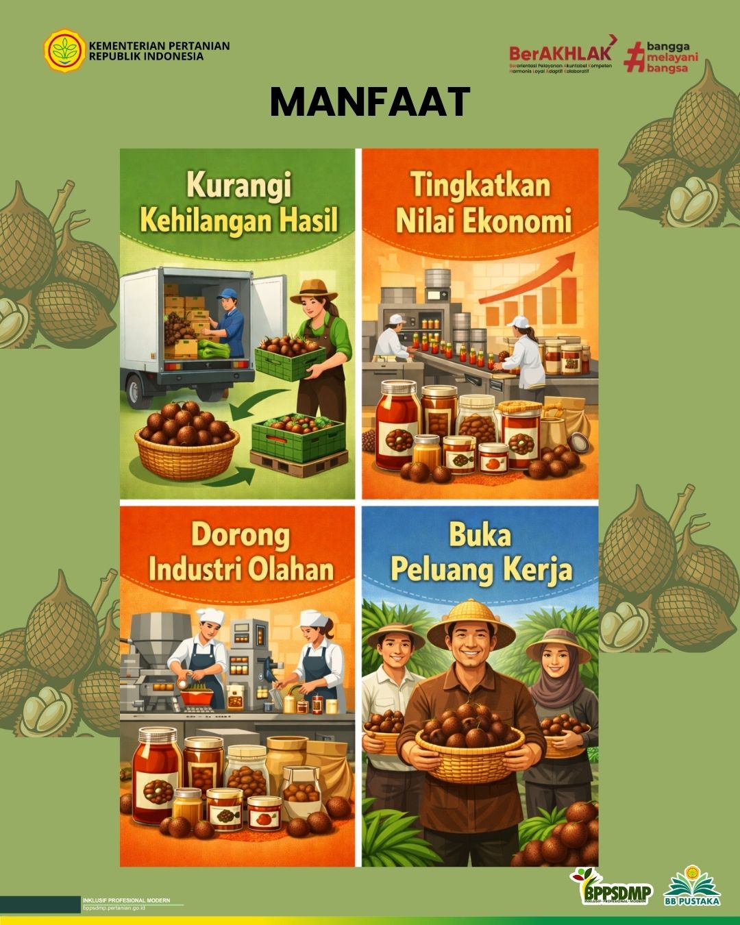 Dengan pengelolaan yang tepat, buah salak tidak hanya menjadi komoditas konsumsi segar, tetapi juga sumber inovasi produk yang bernilai tinggi. Pendekatan no waste menjadi solusi strategis dalam menjawab tantangan kehilangan hasil pascapanen sekaligus mendorong pengembangan pertanian yang lebih efisien, produktif, dan berkelanjutan. (DHIRA'26)