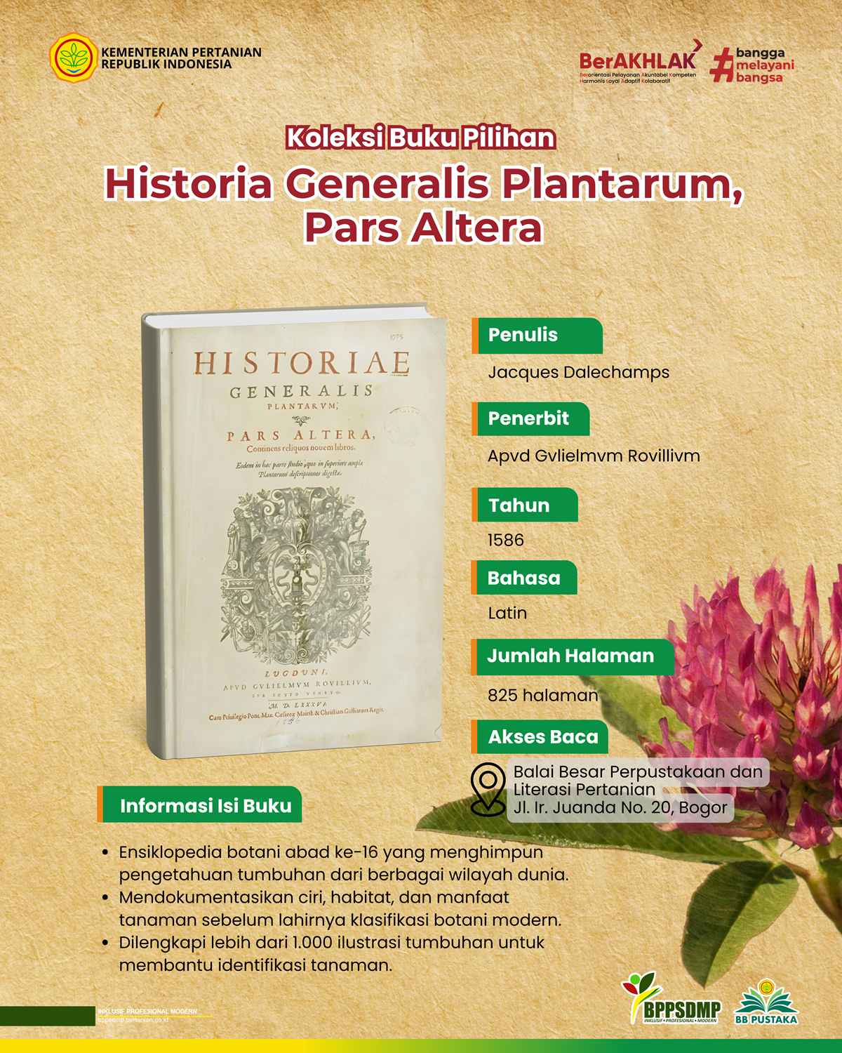 Historia Generalis Plantarum karya Jacques Dalechamps merupakan salah satu karya botani penting dari masa Renaisans yang diterbitkan pada tahun 1586 di Lyon, Prancis. Karya ini ditulis dalam bahasa Latin dan disusun dalam delapan belas bab yang membahas berbagai jenis tumbuhan secara sistematis. Buku ini menjadi salah satu rujukan utama dalam studi botani sebelum munculnya sistem klasifikasi modern yang diperkenalkan oleh Carl Linnaeus pada abad ke-18. Melalui karya ini, Dalechamps berusaha mengumpulkan dan menyusun pengetahuan tentang tumbuhan yang berasal dari berbagai tradisi ilmiah. Selain memiliki nilai ilmiah yang tinggi, buku ini juga memiliki nilai historis yang penting karena merupakan koleksi buku tertua yang tersimpan di Balai Besar Perpustakaan dan Literasi Pertanian, Kementerian Pertanian Republik Indonesia.