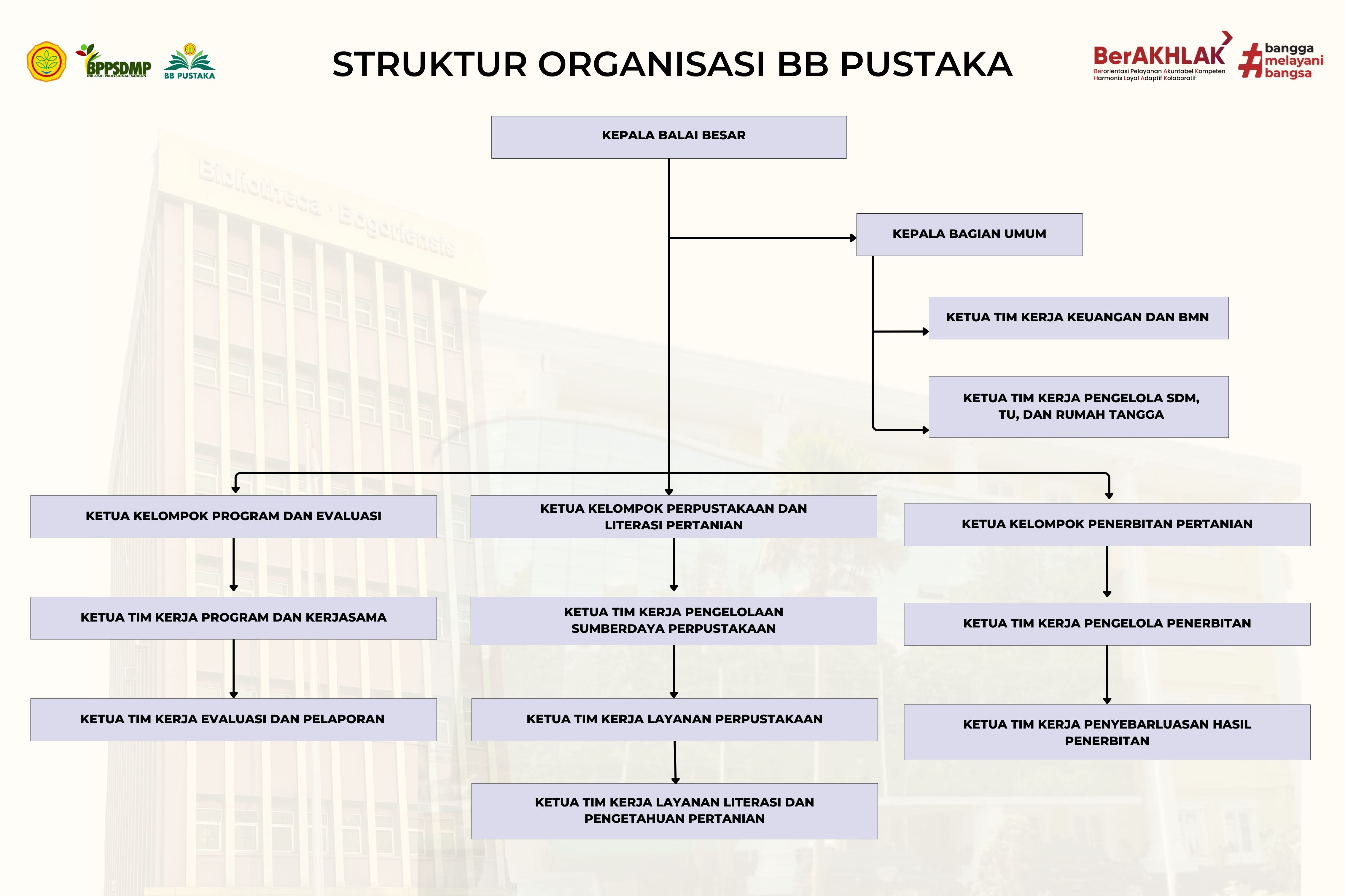 Struktur organisasi dan Rincian Tugas Pekerjaan Unit Kerja Balai Besar Perpustakaan dan Literasi Pertanian berdasarkan Permentan Nomor 11 Tahun 2025